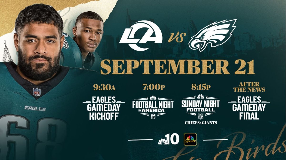 2+ mon, 1+ week ago (381+ words) The undefeated Philadelphia Eagles (2-0) take on the undefeated Los Angeles Rams (2-0) on Sunday in a rematch of their tightly contested divisional round matchup from a year ago. NBC10 will have pregame and postgame coverage for the Week 3 showdown on Sunday, Sept. 21. Here's how to watch. Eagles Gameday Kickoff airs on NBC10 and streams on the NBC10 streaming channel as well as the video embedded on top of this article on Sunday, Sept. 21, at 9:30 a.m. NBC Sports Philadelphia's Amy Fadool will host the show which will include an exclusive feature with Eagles safety Reed Blankenship as he surprises a local school with a donation to their STEAM program and meets with students. The show will also include an exclusive feature with Eagles legend Brandon Graham who is now a contributor to Good Morning Football, the NFL's daily national football morning show. The show will also…...